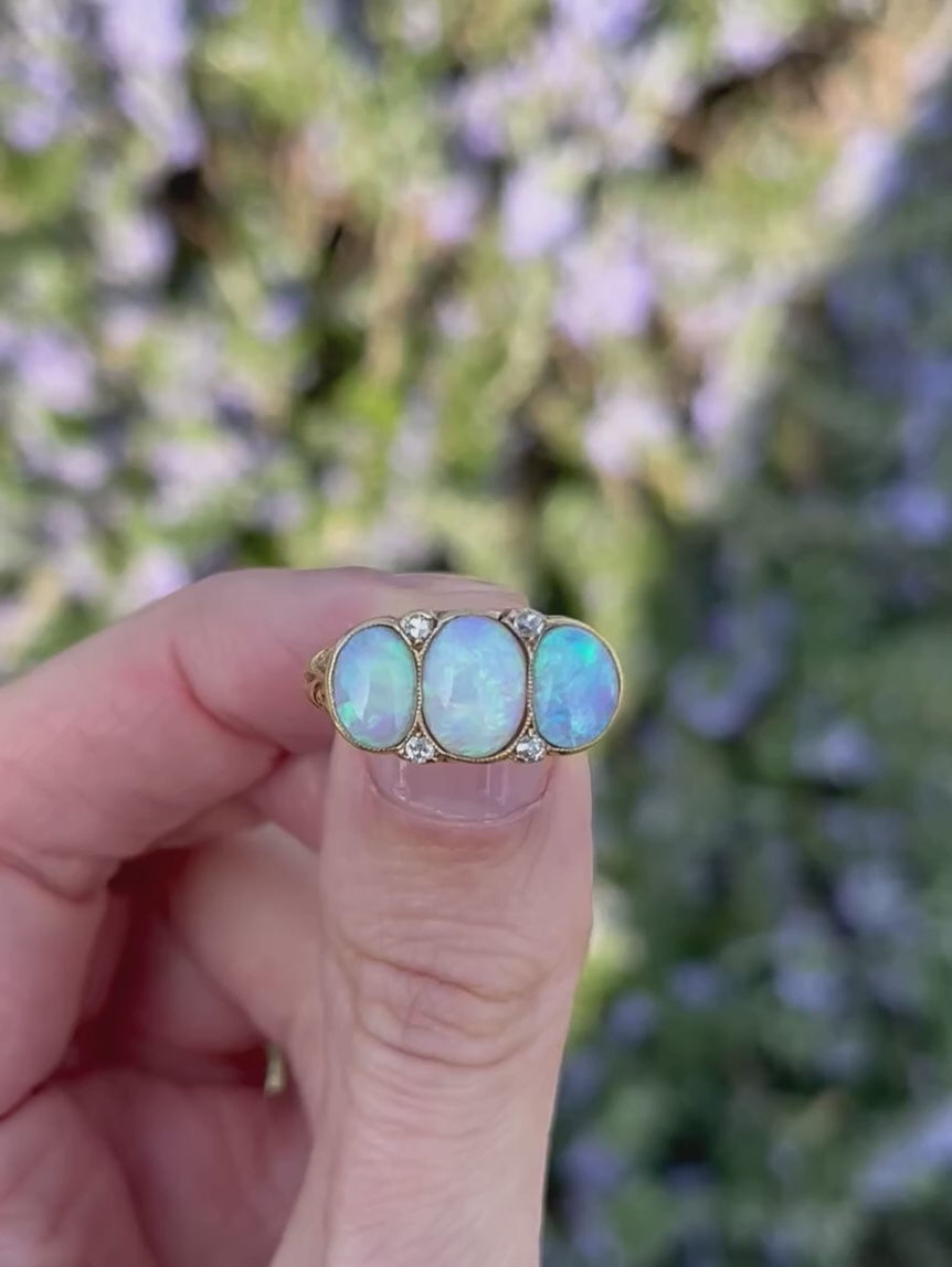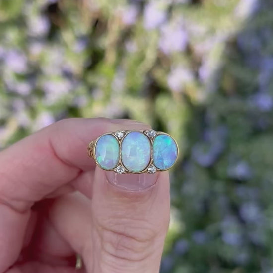 "This ring was made in 1898 and it is most likely that the opals in it came from Australia. It would have been very fashionable at the time. The opals are very well matched and display a gorgeous play-of-colour of predominantly vibrant greens and cornflower blues with flashes of reds and purples.