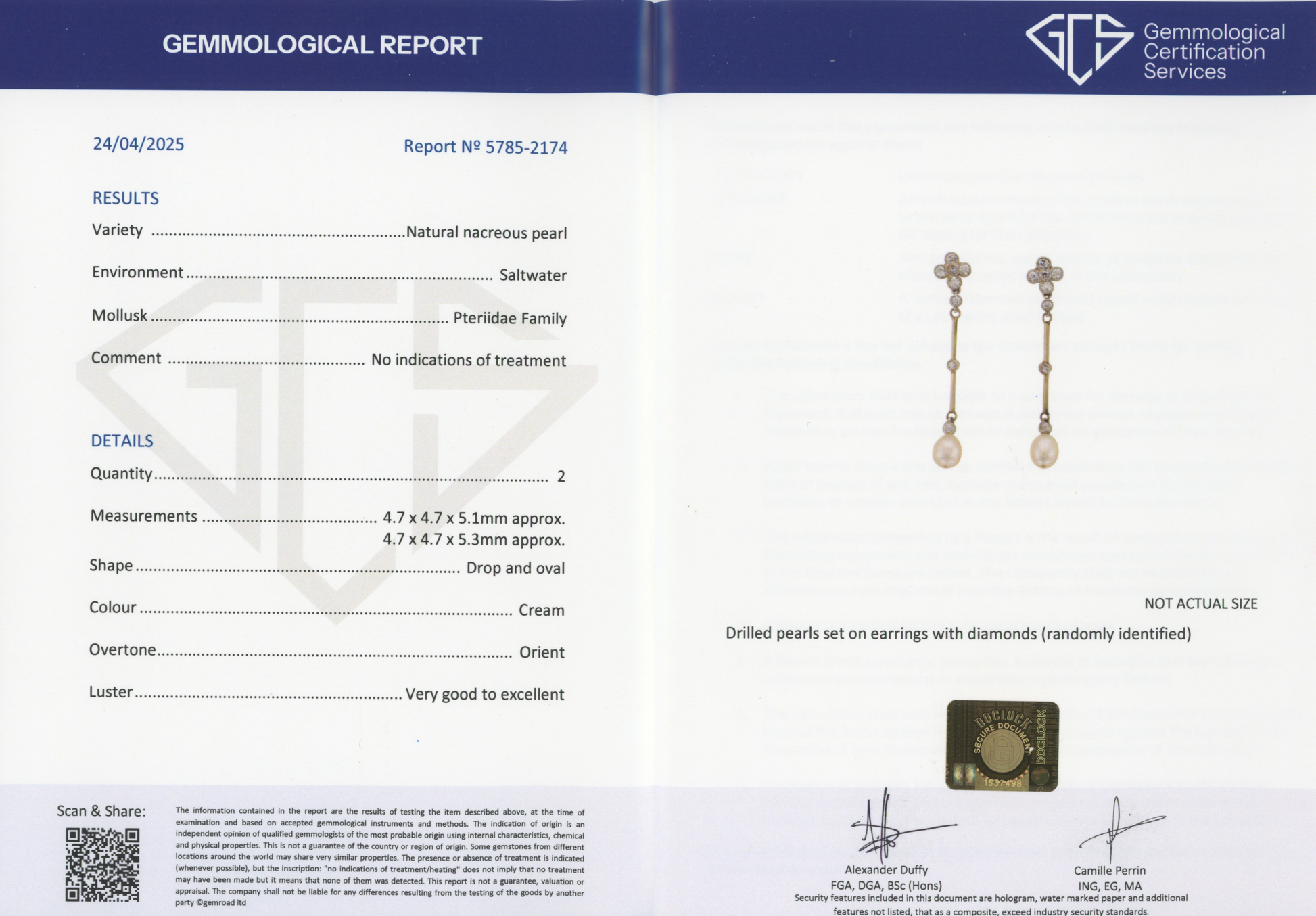 The earrings are accompanied by a report from GCS: natural, saltwater pearls.