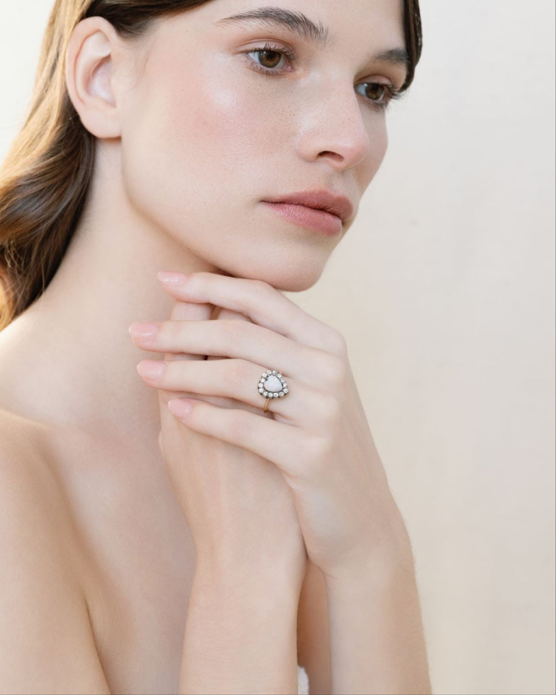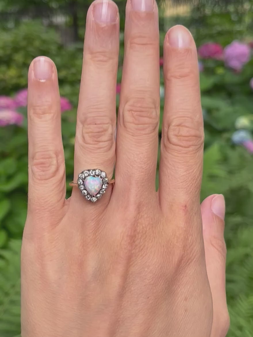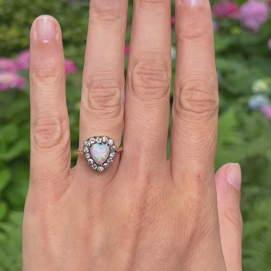 "In late 19th century jewellery, we see a lot of carved opals, a gemstone which Queen Victoria was very fond of. Victorian heart-shaped opal and diamond clusters are still highly coveted and this one is especially lovely as the opal has a fine play of colour and the diamonds really glisten."