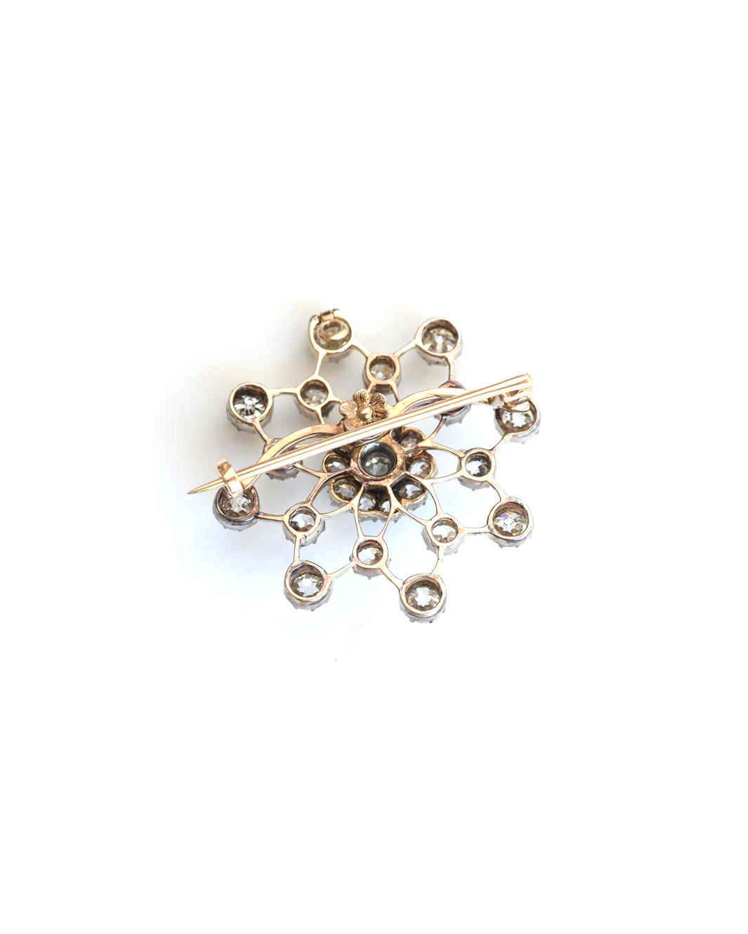 A striking starburst pendant/brooch, made circa 1880-1900. Set throughout with old mine brilliant-cut diamonds in cut-down silver settings, on an openwork star-shaped gold frame. With removable pendant bale and brooch fittings.